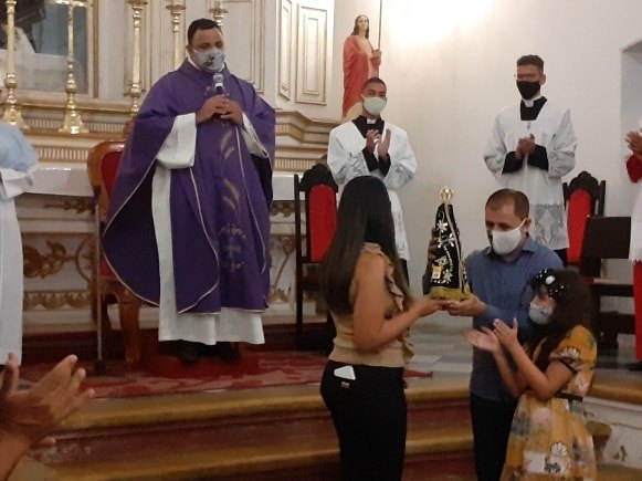 Os paroquianos, liderados pelo Pe. Rodrigo Maia, entregaram uma imagem de Nossa Senhora de Aparecida ao prefeito e família, como forma agradecimento.